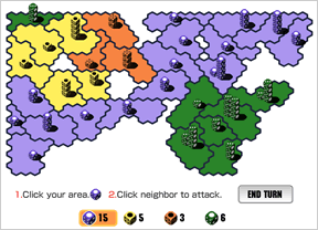 The game play is simple, click on the "attack from" area, and then click on the "attack to" area. The battle depends on the numbers roll out by the dices in these two areas. More dices, more changes to win, but it always surprise you. You will get extra dices after each round, depends on the number of connected areas of you get.